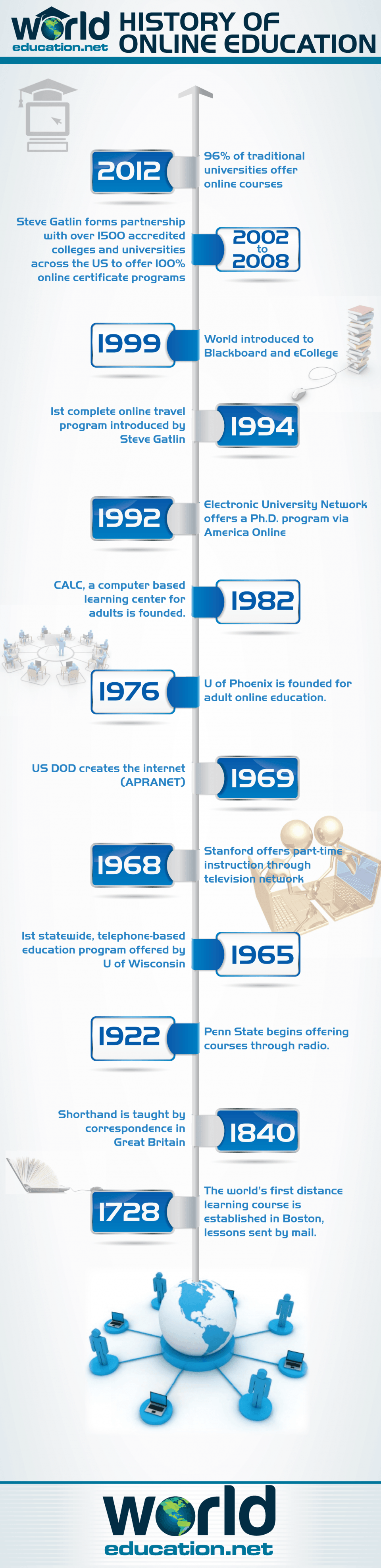 In 1728 the Boston Gazette ran an advertisement for a course in the “new method of Short Hand.” Teacher Caleb Phillips mailed his weekly lessons to students, giving rise to a revolutionary new approach to learning which over the centuries has evolved into today’s Online Education. The History of Online Education Infographic presents some notable events that have shaped the current landscape of distance learning over the centuries.