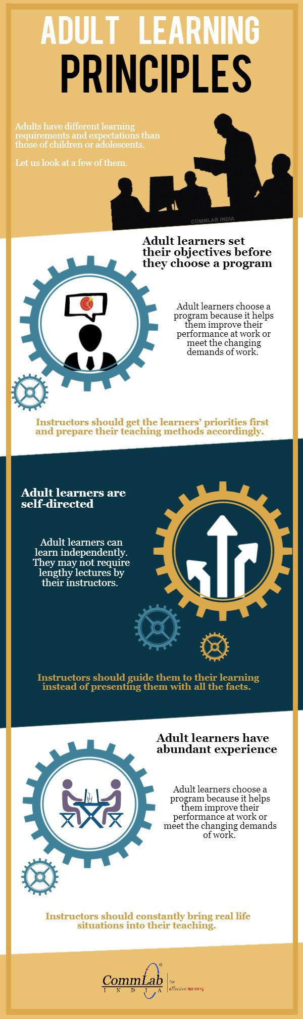 Adult education, officially known as “Androgogy”, is well-defined as the set of definite abilities and related knowledge geared towards the educational development of adults. The way learning happens in children and the way learning happens in adults are completely different. Adults are self-focused and are probable to take the responsibility for their own judgments. Malcolm S. Knowles, theorist of adult education has identified six principles putting some assumptions of how adults learn. The Adult Learning Principles Infographic talks about those principles of adult learning.