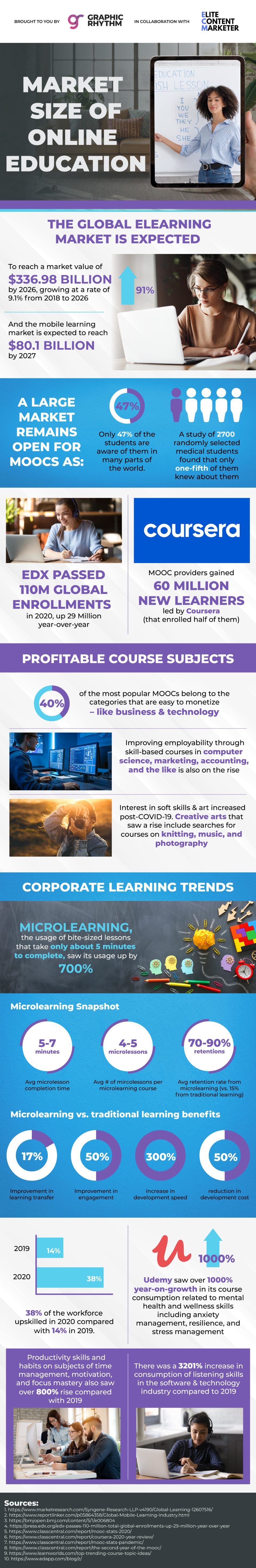 To help you make sense of this acceleration in Elearning, Graphic Rhythm has designed an infographic presenting key online education stats. It presents a few data-backed profitable course subjects and corporate learning trends you can leverage to create your first online course.