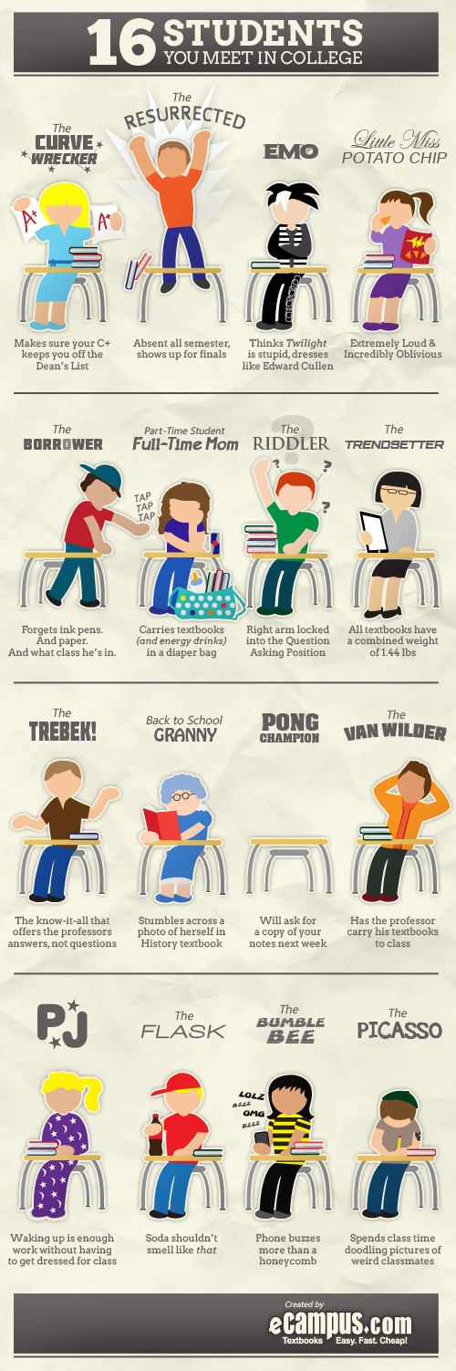 Every classroom in college is bound to have a student or two that sticks out from the rest. Whether that's a good thing or a bad thing is in the eye of the pencil holder. The 16 Students You Meet In College Infographic lists 16 types of students you will mostly likely be meeting during college.