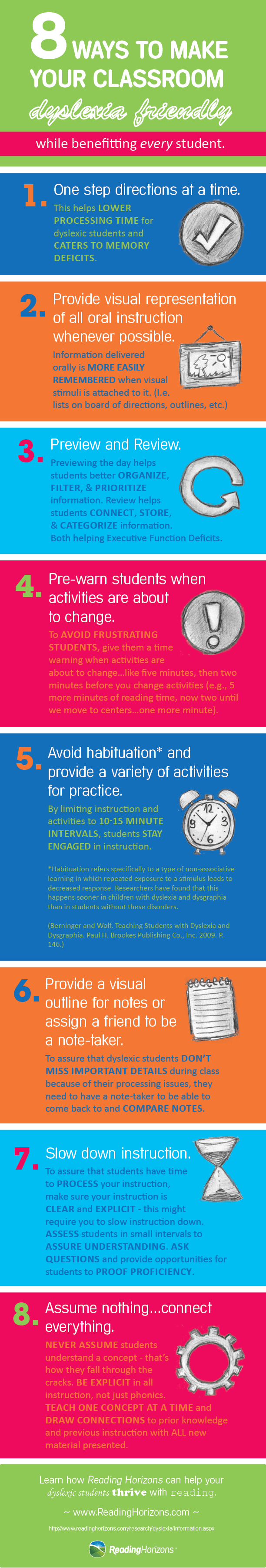 - Never expect dyslexic students to take notes without a visual outline or a friend to be a note-taker.