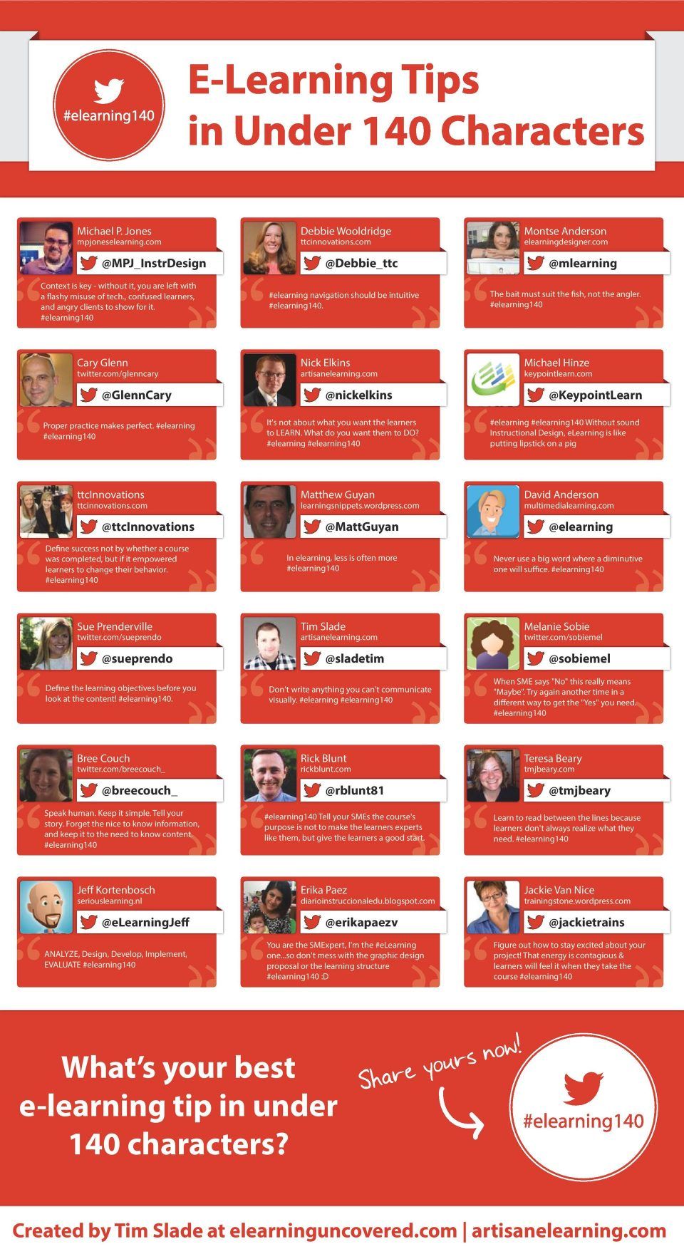 The eLearning Tips in 140 Characters or Less Infographic presents the best e-learning tips people shared on Twitter using the hashtag #elearning140.