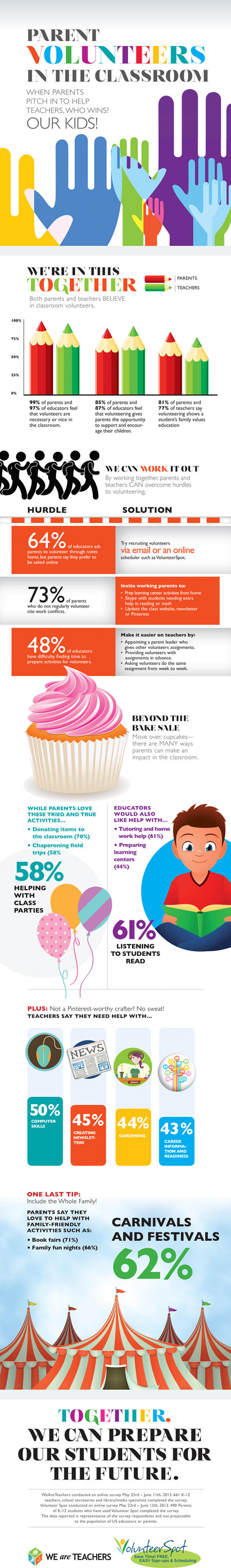 Parent Volunteers in the Classroom Infographic presents key data in understanding the need and use of parent volunteers in schools - where they can be most useful in the classroom, how they impact the learning environment, and where disconnects in communication and coordination lie between teachers and parents.