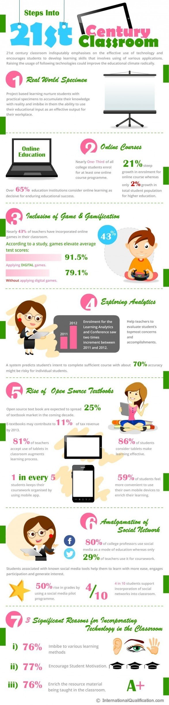 The Stepping into a 21st Century Classroom Infographic looks at 7 key points which indicate that the 21st century classroom has given a new dimension to education involving students to use various applications, Web 2.0 and other technological tools. The modern educational system emphasizes more on technology and practicality to prepare their students as perfect future employees so that they don’t fall short in any circumstances at their workplace.