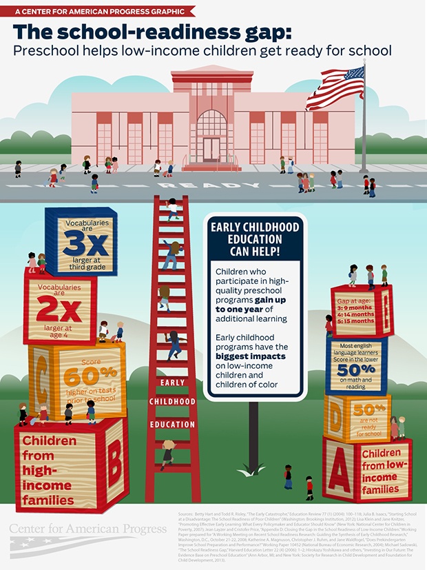 The School-Readiness Gap Infographic presents the barriers that children from low-income families face in getting ready for school and how access to early childhood education programs can help them.