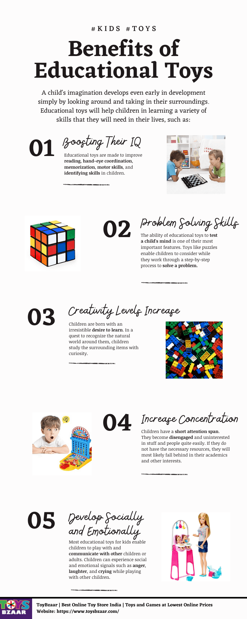 These days, toys are more than just essentials. Children enjoy playing with them and discovering their functions. The question is whether you could use some of these toys to enhance their everyday life. The answer is YES, but it depends on whether you know where to look. A child’s imagination develops even early in development simply by looking around and taking in their surroundings. Educational toys will help children in learning a variety of skills that they will need in their lives. Today’s children are growing up in a more competitive world than previous generations. This challenge is magnified by the fact that more children are attempting to juggle multiple careers and hobbies simultaneously. They want to do well academically, but they also want to have time to play and compete with other kids in activities that are close at hand. The benefits are mentioned in the infographic.