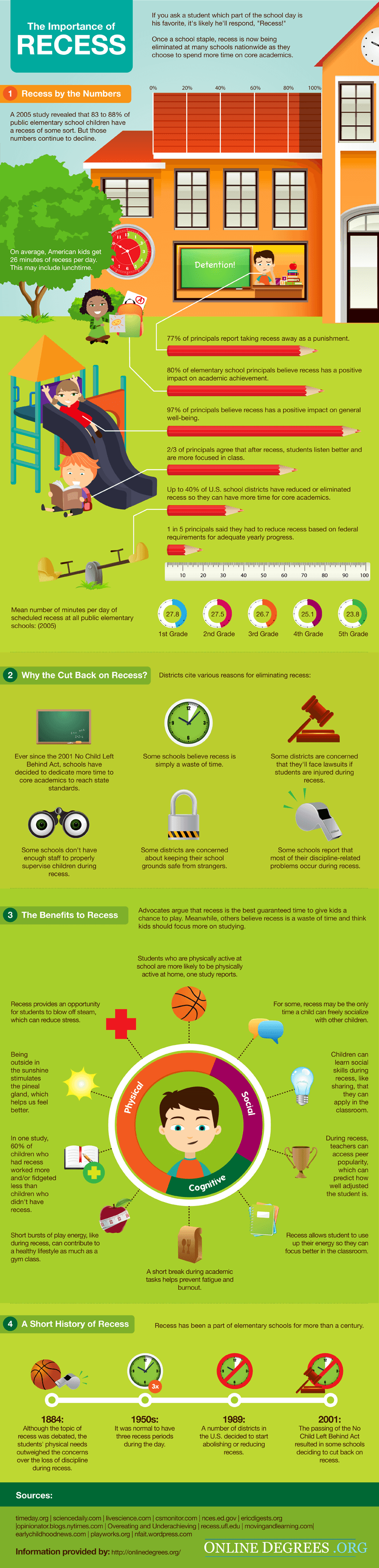 Nationwide, recess time has been cut dramatically (some kids don’t even get any recess at all anymore). Since the implementation of No Child Left Behind, many schools have had to shave off an average of 50 minutes or more of recess time per week to keep up. Kids who do poorly in school and on standardized tests or live below the poverty line, in particular, see less recess time than their classmates. The Importance of Recess Infographic highlights the significance of recess and how it can positively affect student’s lives. With the rise of childhood obesity in the United States recess is a staple that should remain in the schools.