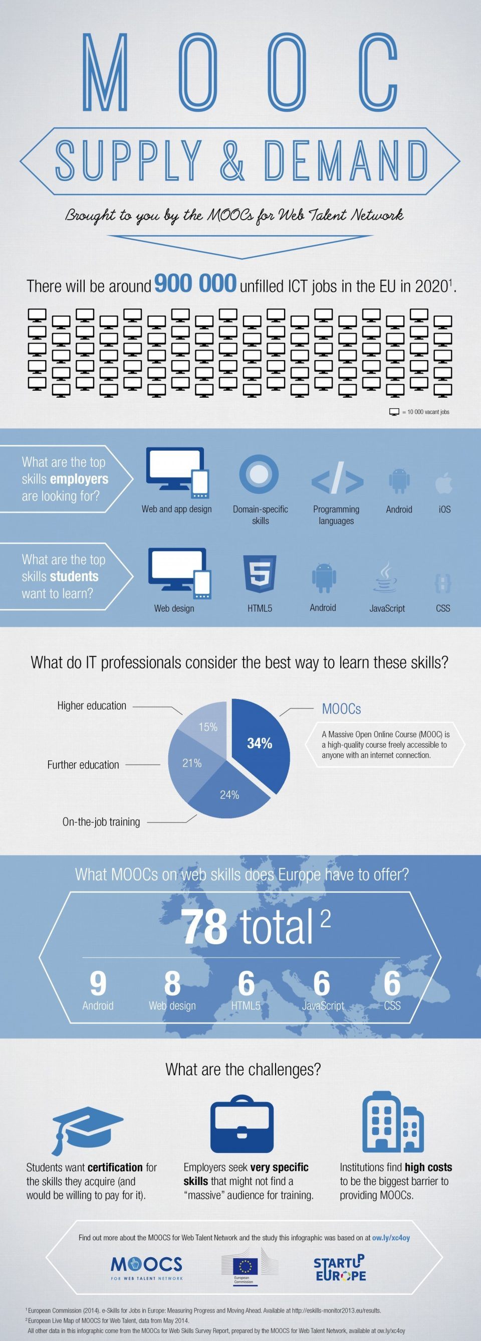 Massive Open Online Courses (MOOCs) have opened new doors for free online learning that lends itself well to ICT-related subjects. Meanwhile, employers seek candidates with relevant web skills. The Supply and Demand of MOOCs Infographic shows what skills are most in demand and what MOOCs are available that teach those skills, based on the results of a study conducted by the European Commission.