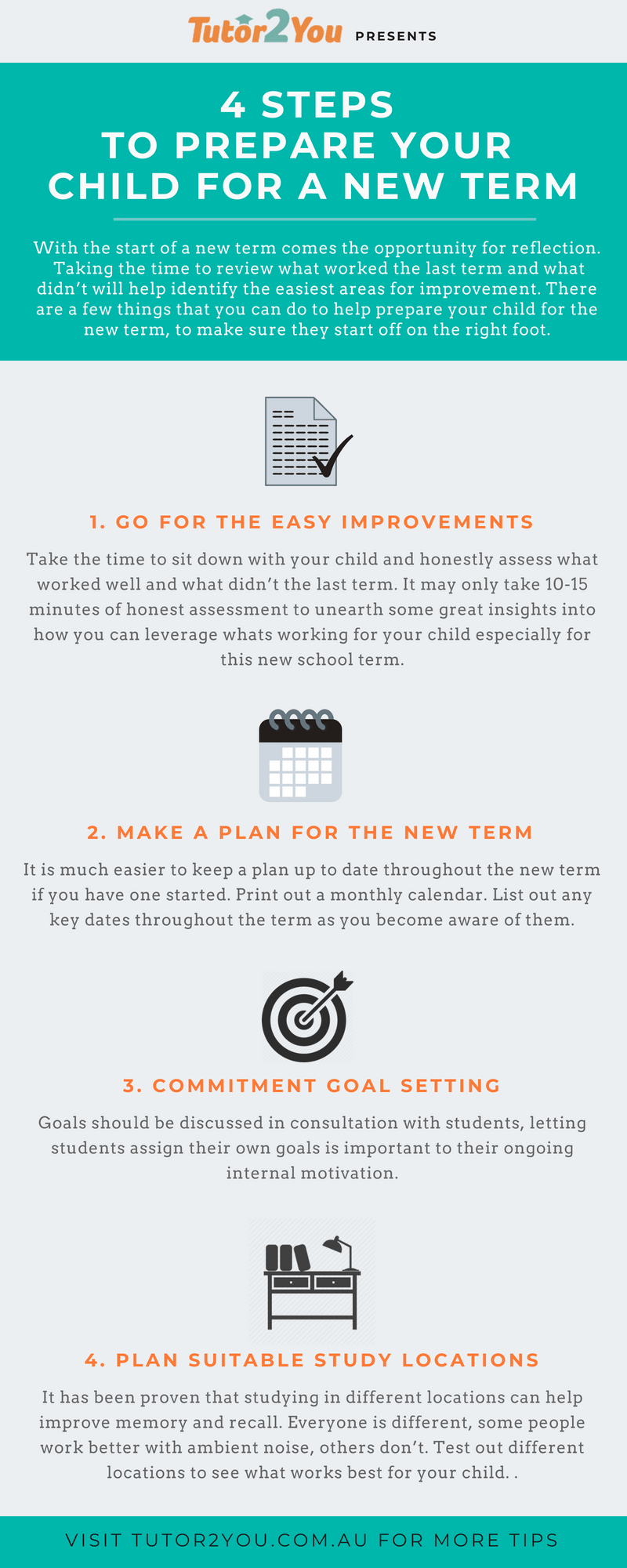With the start of a new term comes the opportunity for reflection. Taking the time to review what worked the last term and what didn’t will help identify the easiest areas for improvement. There are a few things that you can do to help prepare your child for the new term, to make sure they start off on the right foot.