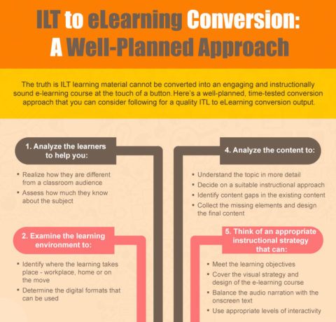 ILT To eLearning Conversion: A Well-Planned Approach—Infographic The truth is ILT learning material cannot be converted into an engaging and instructionally sound eLearning course at the touch of a button. Here's a well-planned, time-tested approach that you can consider following for a quality ILT to eLearning conversion output. 1. Analyze The Learners To Help You […]
